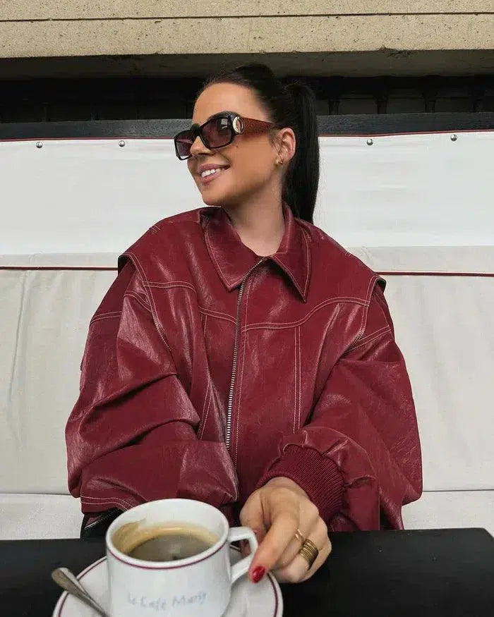 Ontdek de Valentina bomberjas, waar gedurfde stijl en dagelijks comfort samenkomen. Gemaakt van vegan leer met een glanzende rode afwerking en contrasterende witte stiksels, is dit een echte blikvanger voor zowel casual momenten als geklede gelegenheden.