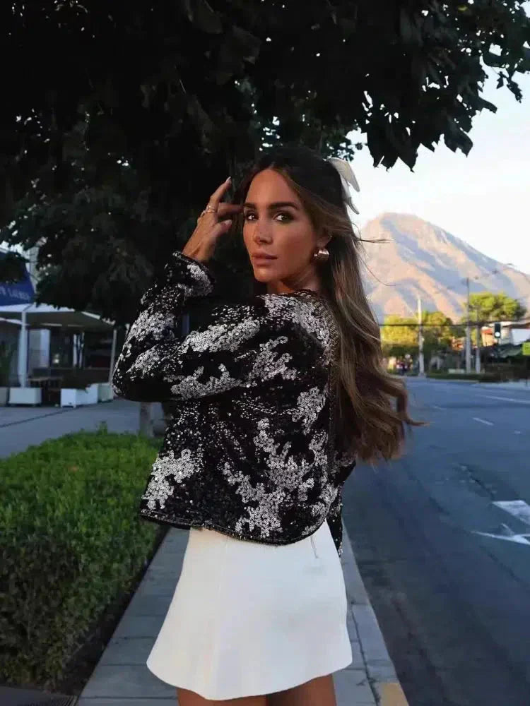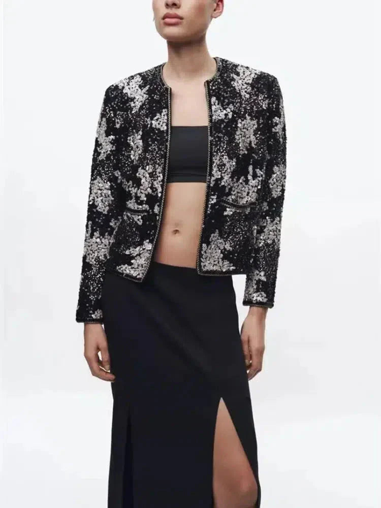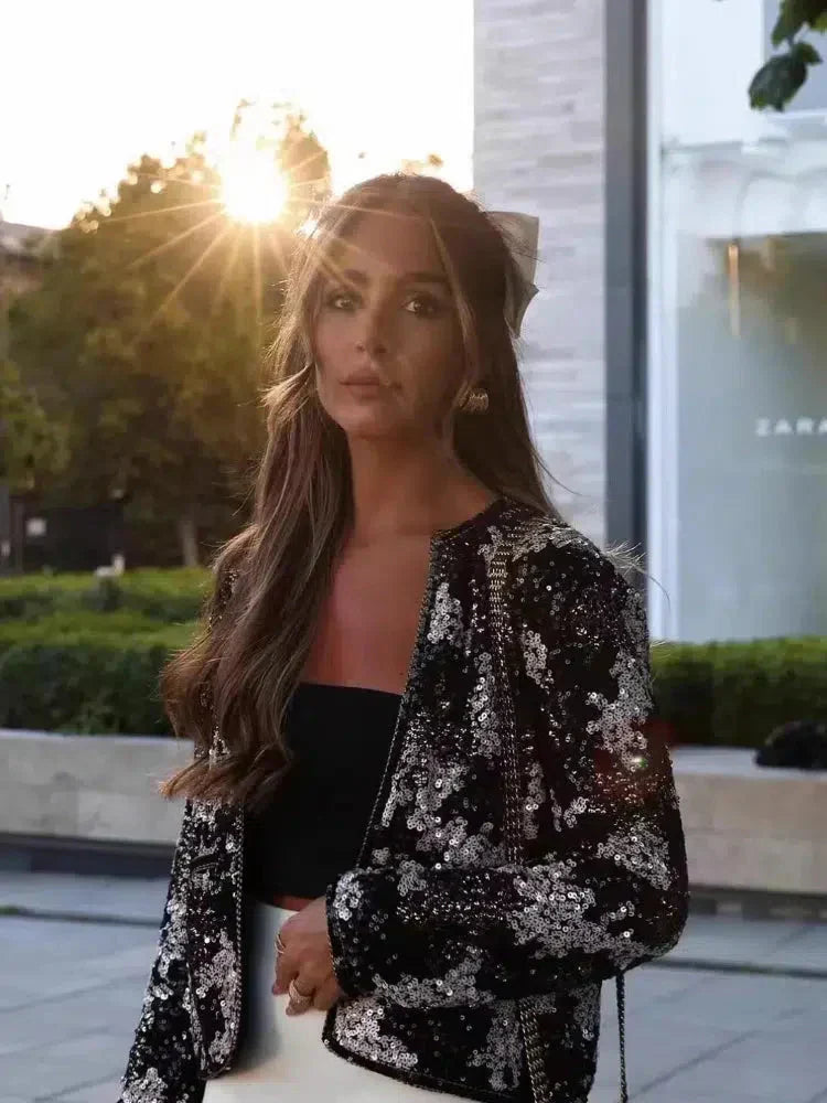 Schitter met zelfvertrouwen in de Viatrix elegante paillettenjas, een opvallend stuk dat elke outfit naar een hoger niveau tilt. Met glinsterende pailletten, een ronde halslijn en een moderne ritssluiting is deze jas de ultieme mix van glamour en verfijning. Perfect voor speciale gelegenheden of wanneer je wilt stralen.
